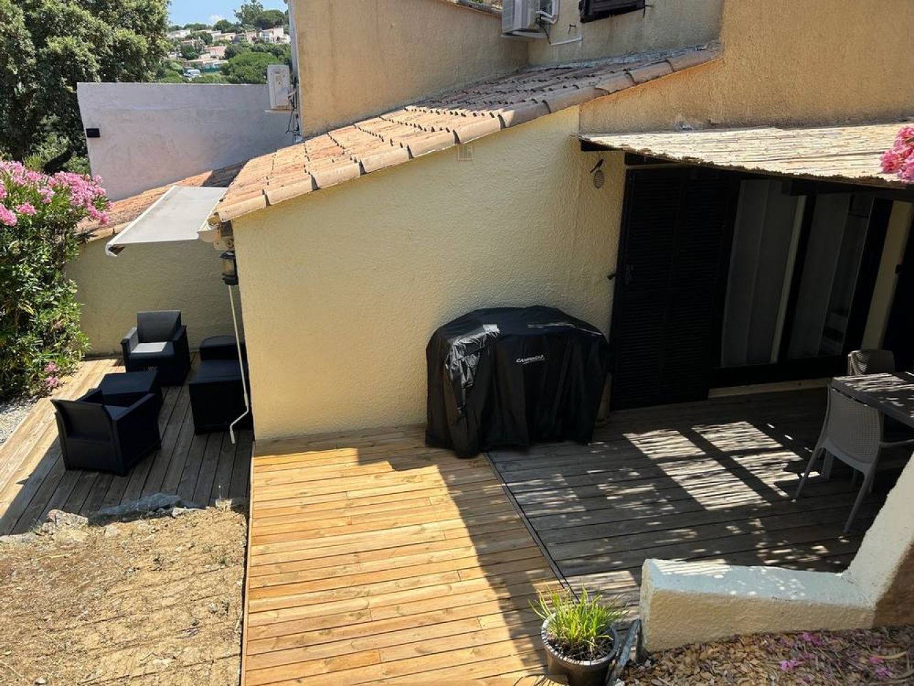 avec barbecue, chaises longues,...